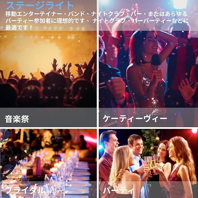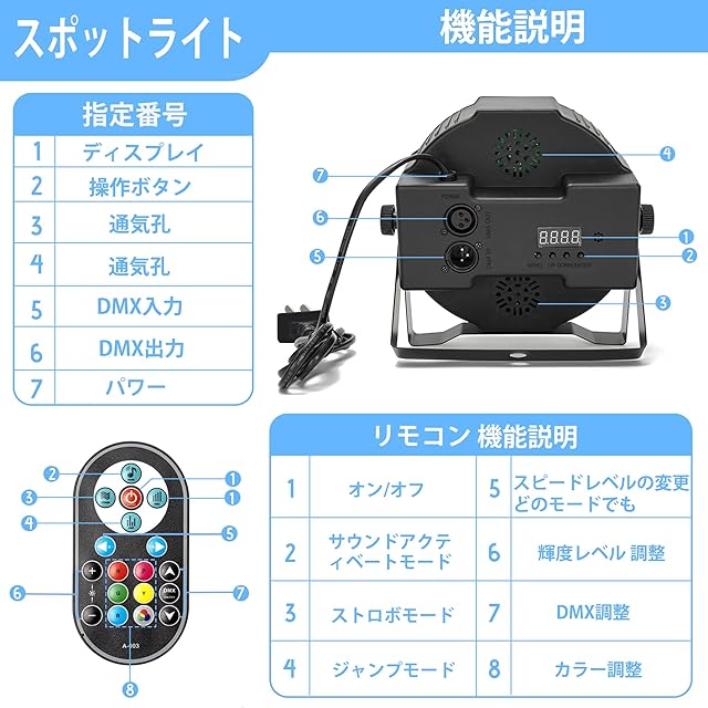 舞台照明はAuto / Sound / DMX / Master-slaveで制御することもできます。 DMXチャンネルは3/7です。パーライトを使用すると、色、調光、ストロボ、サウンドを変更できます。多段階の効果が得られます。また、ファンクションボタンを操作することで効果を簡単に得ることができます。