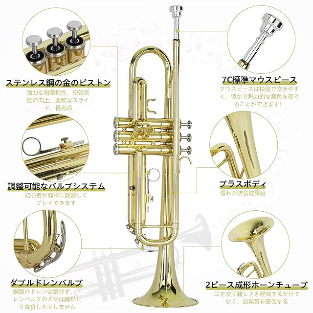 さまざまな場面で使用されています:吹奏楽、オーケストラ、ジャズ、ポップ、ロックなどのさまざまな音楽ジャンルは、勇猛な印象を与えます。付属品の内容:トランペットx 1、布x 1、7 Cノズルx 1、ハード収納ボックスx 1