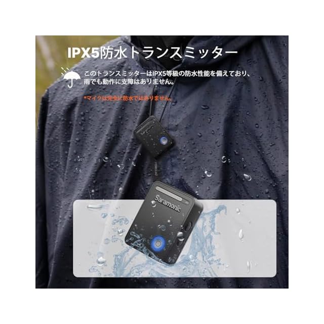 雨になっでも自信があります トランスミッターにはIPX5定格の耐水性が付属しているため、雨になっても、送信機と受信機の両方で6時間のバッテリー寿命があれば、中断することなく作業に集中できます。アウトドアにも最適です。