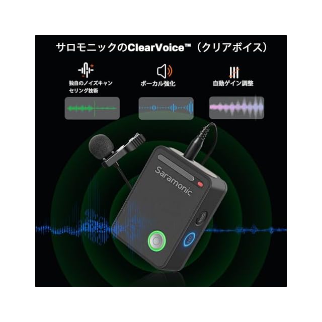 いつまでもクリアなサウンド SaramonicによるClearVoiceは、インテリジェントなノイズキャンセルでバックグラウンドノイズをフィルターしますが、ボーカルブーストとローカットモードは、あらゆる設定に合わせてサウンドを調整するのに役立ちます。自動ゲインコントロール(AGC)は、オーディオレベルをその場で適応させ、音声が手動で調整せずに明確でバランスを保つようにします。