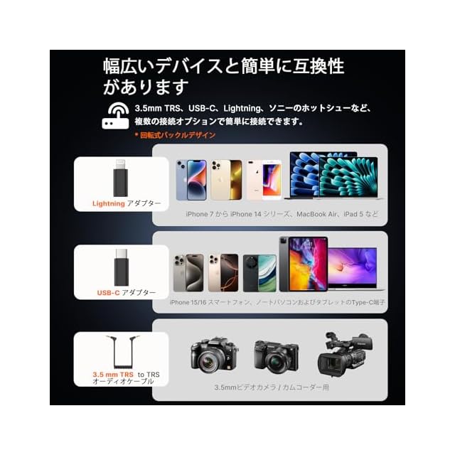 幅広い互換性 3.5 mm TRS、USB-C、Lightning、Sony Multi-Interface Hot Shoe*の複数のオプションで簡単に接続します。幅広いデバイスとセットアップと簡単に互換性があります。
