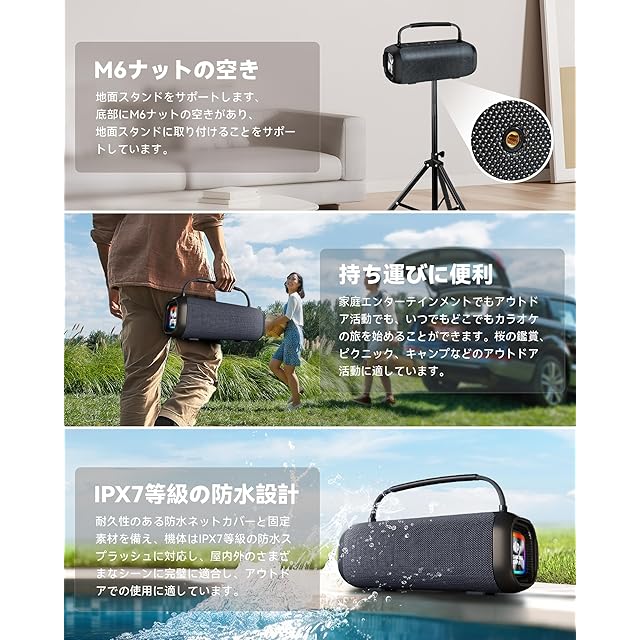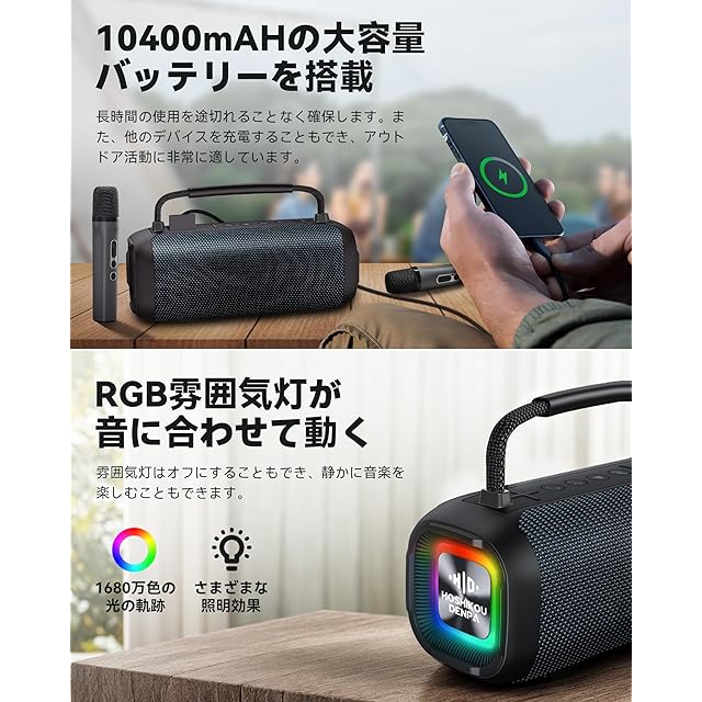 【カラフルRGBライト搭載】スピーカーの両側に配置されたRGBライトは音楽のビートに合わせて動き、ダイナミックで楽しい雰囲気を演出します。カラオケセットのRGBライトはオフにすることもできるため、落ち着いて音楽を楽しむシーンにも対応。ポータブルスピーカーはアウトドアでもパーティー感を盛り上げます。