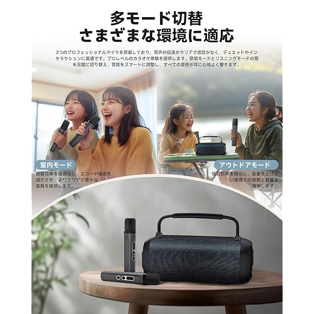 【3つのモードで最適な音響効果】ワイヤレスマイクはスマート音響モードを備え、ボーカルモード、カラオケモード、マイクモードの3種類を簡単に切り替え可能。カラオケセットはどのモードでもクリアな音声伝達を実現し、家族のカラオケタイムやアウトドアでの使用にも最適です。ポータブルスピーカーはノイズキャンセリング技術により、周囲の雑音を軽減し快適に歌えます。