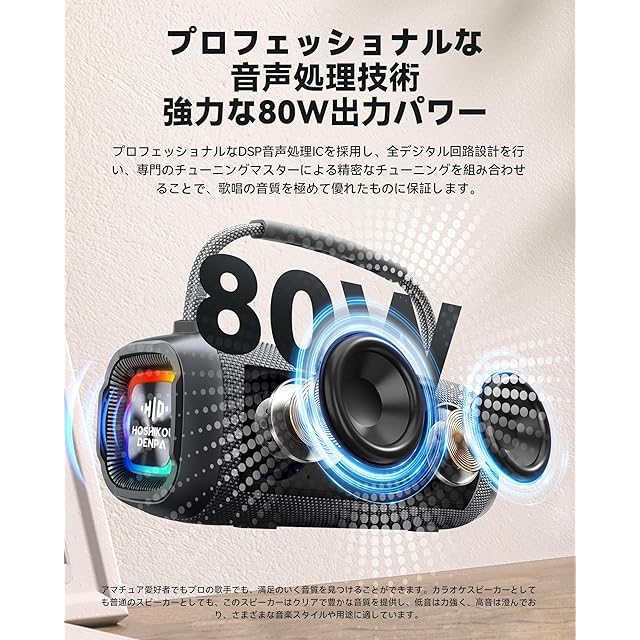 【プロ仕様の高音質とパワフルな出力】スピーカーはプロフェッショナルな音声処理技術を採用し、80Wの強力な出力でクリアで迫力のある音響体験を実現します。カラオケセット家庭用は高性能DSPチップとデュアル低音ダイアフラムにより、カラオケや音楽再生時に臨場感あふれるサウンドを提供。ブルートゥーススピーカーの高音域はシャープ、中音域は滑らか、低音域は深みのある豊かな音質を楽しむことができます。