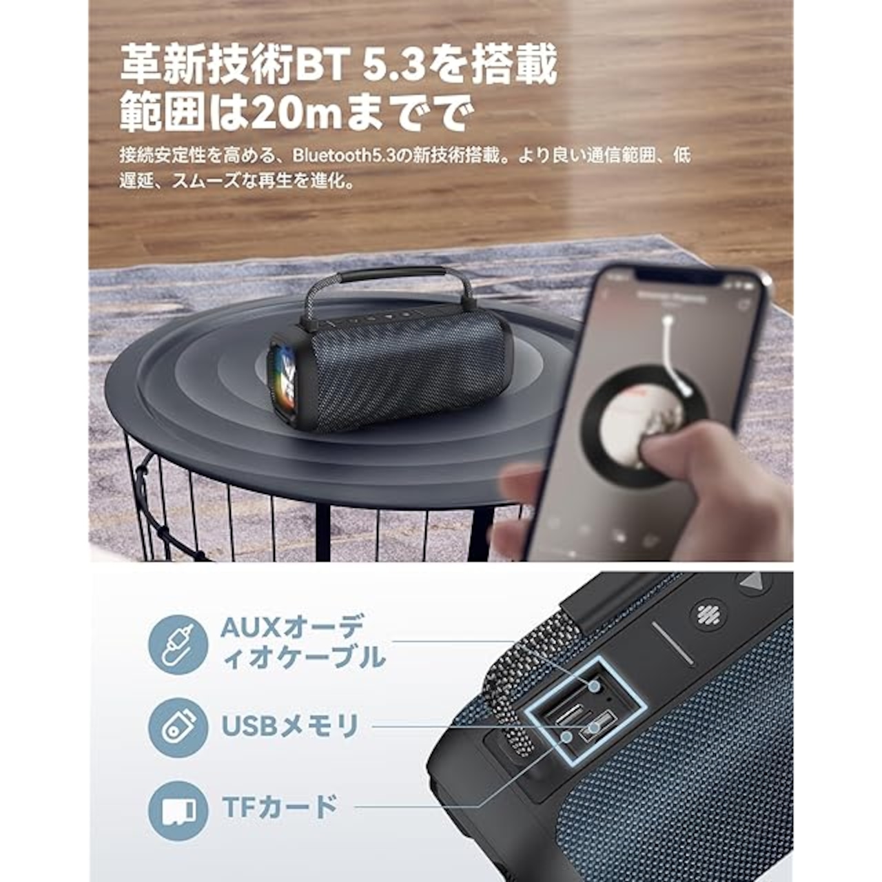 【多様な接続方法で幅広い互換性】BluetoothスピーカーはTFカード、USB、AUXに対応しており、スマホ、タブレット、PCなどさまざまなデバイスと接続可能。ワイヤレススピーカーはシンプルでわかりやすい操作パネルにより、初心者でも簡単に使いこなせます。家庭用カラオケセットとしても抜群の利便性を発揮します。