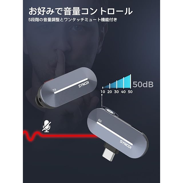 【音量コントロール&ミュート機能付き】SYNCO P2S受信機の音量調節ボタンを一回押すと、5段階で音量調整ができます。また二回押してミュート機能のオン/オフが簡単にして、撮影中止せずに済みます。動画撮影のペースを自由に設定できます。