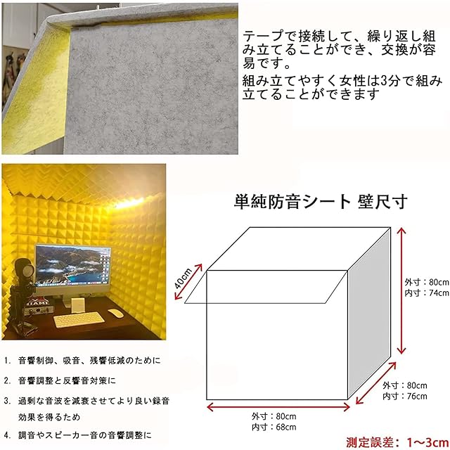 【吸音】簡易防音室。高密度難燃吸音綿、環境にやさしい素材、より健康的、 防音ブースの表面は12mmの高密度ポリエステル繊維吸音板(最大5.8kgの密度)で作られ、内層は50mmの難燃性高密度吸音綿で作られています。エコーと反射を効果的にキャンセルし、音響ノイズと背景音を低減します。 音の明瞭度を大幅に向上させ、最適な録音条件を作り出します。理想的な録音・レコーディング環境を実現!