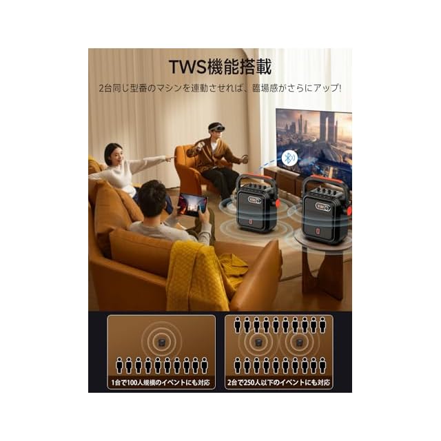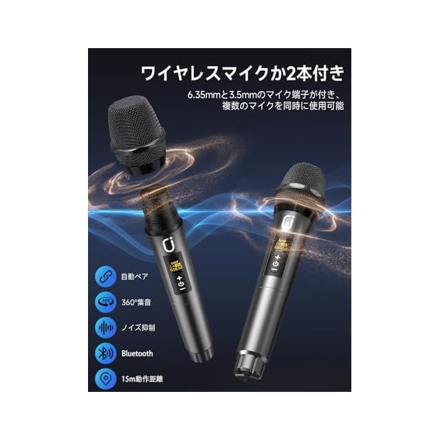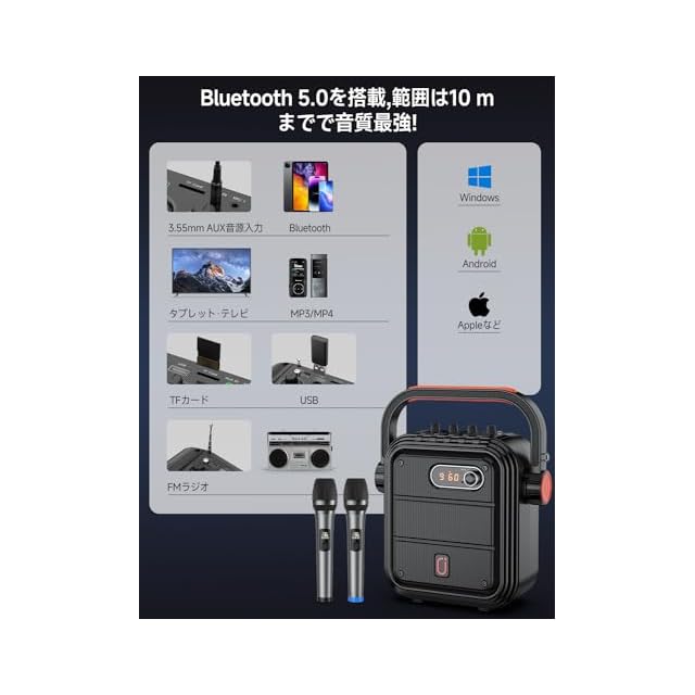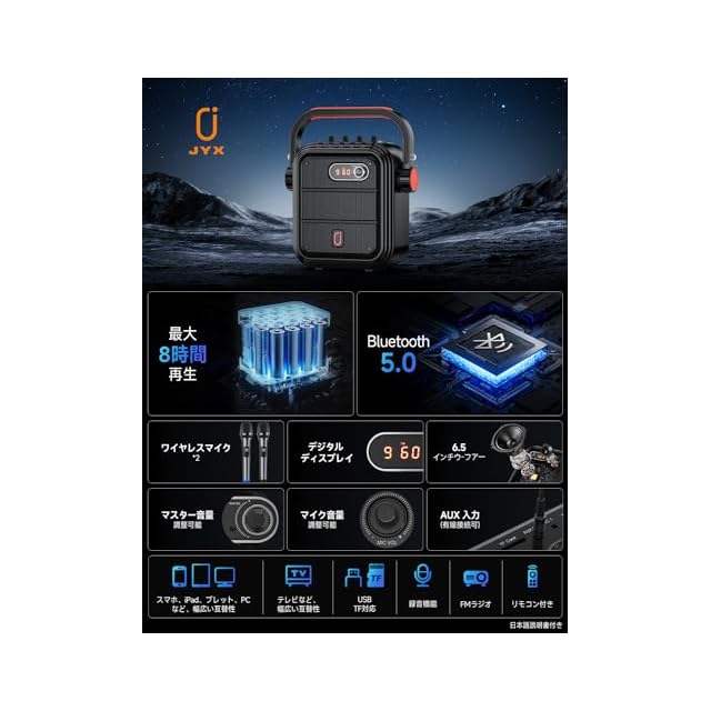 【ワイヤレスステレオペアリング】最先端Bluetooth 5.0が搭載されたスピーカーで、接続性は良くて、外部入力からの音楽などをスピーカーから出力することができます。「音飛び」や「音切れ」を大幅に改善することができます。TWSモードで二台のJYX-66のスピーカーがペアリングができます、驚きの臨場感あふれるステレオサウンドをお楽しめます。※TWS接続はJYX-66(同じなモデル番号)しかペアリングできません。ワイヤレスマイクが2本付属しています(内蔵レシーバー)。