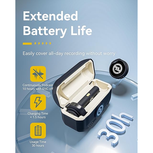 「30時間動き」LARK M2ワイヤレスマイクは、単回10時間(ENCオフ時)の使用が可能です。充電ケースでセット全体を2回フル充電でき、1回の充電にかかる時間は1.5時間です。充電ケースを使用した場合、COMBO版のバッテリー持続時間は40時間です。もうバッテリー残量を心配する必要はありません。
