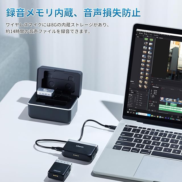【パワフルなバッテリー持続時間&最大20時間+持続】 内蔵の充電ケースデザインにより、充電と収納を両立させ、屋外で長時間録音時のバッテリー持続に安心を提供します。 Ulanziの実験室テストによると、レシーバーは約6時間動作可能で、トランスミッターは約14時間動作可能です。電力が消耗された後、充電ケースに入れて充電することができ、充電が完了すると6〜14時間継続して作業することができます。更に、受信機が充電しながら収録できます。充電ケースの電力が尽きるまで、総合的なバッテリー持続時間は20時間以上に達します。