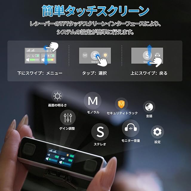 【シンプルかつ簡単操作&OLEDタッチ画面】充電ケースを開くだけで、トランスミッターとレシーバーが自動的にペアリングされるため、すぐに録音を開始できます。USB-CとLightning対応のアダプタが付属されているため、スマートフォンに差し込むだけで簡単に接続が可能です。また、レシーバーに搭載したタッチスクリーンで、ノイズリダクションレベルやゲイン調整といった設定を簡単にカスタマイズできます。