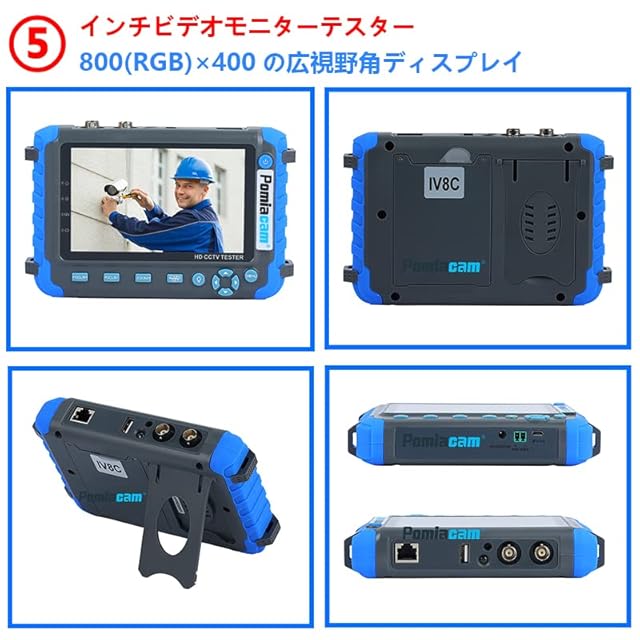 【4 in1多機能CCTVテスター】5.0インチ800(RGB)x480高解像度視野角 。サポートCVBS + AHD (8MP) + TVI (8MP) + CVI (8MP) カメラテスト、4 in1 CCTVテスターモニター。 (IP カメラには対応していません。 IV8C は VGA/HDMI 入力をサポートしません。)