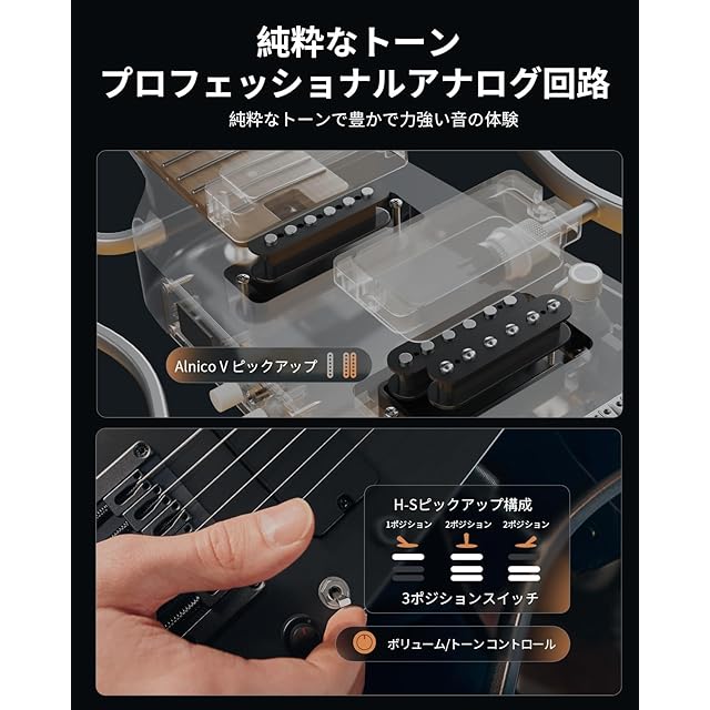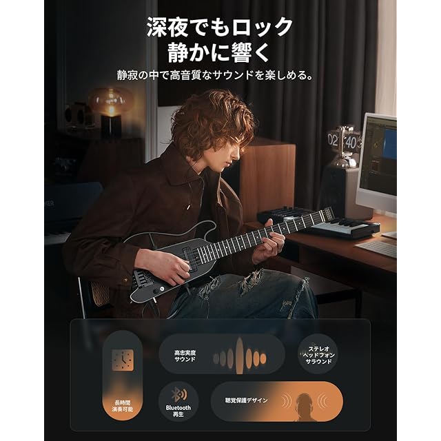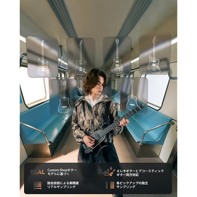 【超軽量 & ポータブル設計】ヘッドレスデザインと内蔵チューナーを搭載し、重量わずか2.4kg、従来のエレキギターの約半分のサイズ。最大5時間のバッテリー駆動&USB-C急速充電対応で、旅行、ライブ、スタジオなどあらゆるシーンで活躍。ギグバッグ、ヘッドフォン、充電ケーブル、1/4”ケーブル、ギターストラップなど、必要なアクセサリーもすべて付属。
