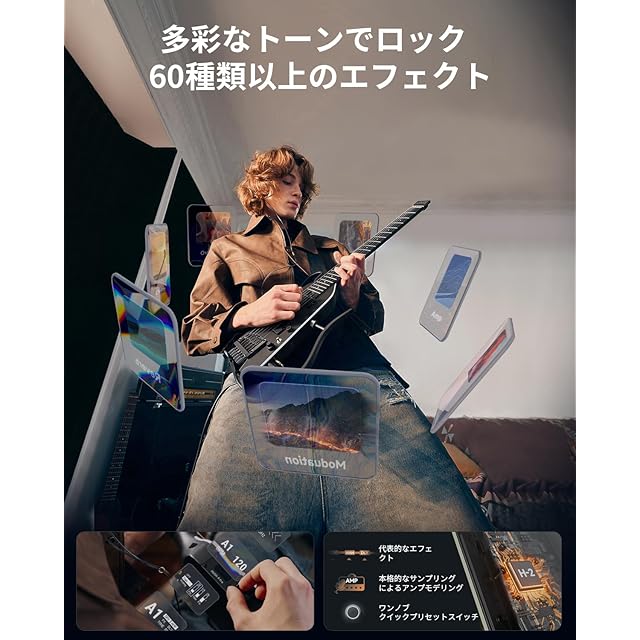 【高精度アンプモデリング】DONNER独自開発のH2チップを搭載し、高度なオーディオアルゴリズムでよりリアルなアンプサウンドを再現。19種類のクラシックアンプモデル&12種類のキャビネットシミュレーションを備え、細かい調整が可能。ライブ、練習、録音など、あらゆるシーンで理想のサウンドを瞬時に切り替えられる。