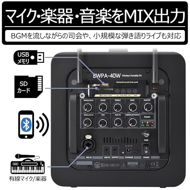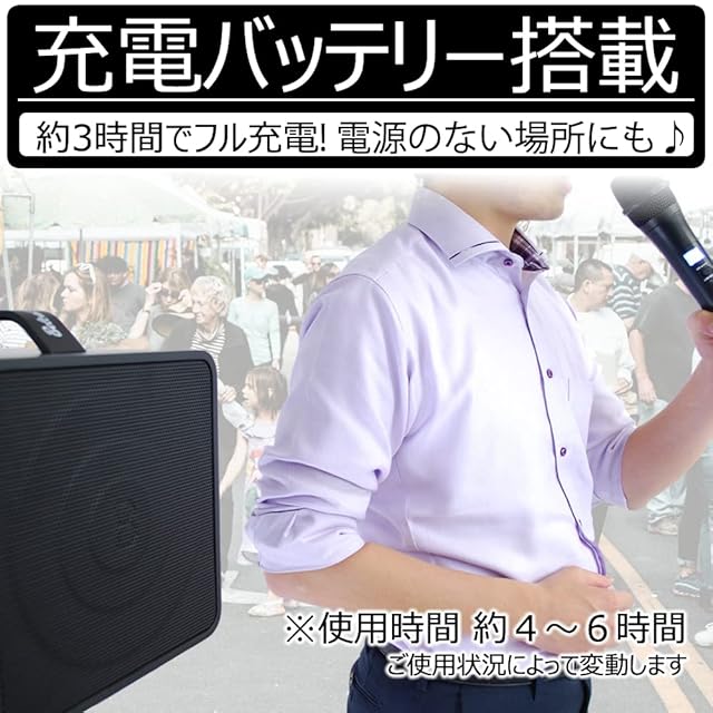 【内容】アンプスピーカー、スピーカースタンド、スピーカー用ケース、スタンド用ケース、ワイヤレスマイク2本、アンテナ2本、電源アダプター、動作確認用電池、日本語マニュアル(保証書)