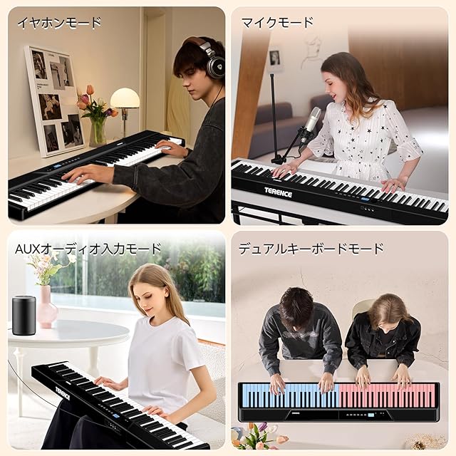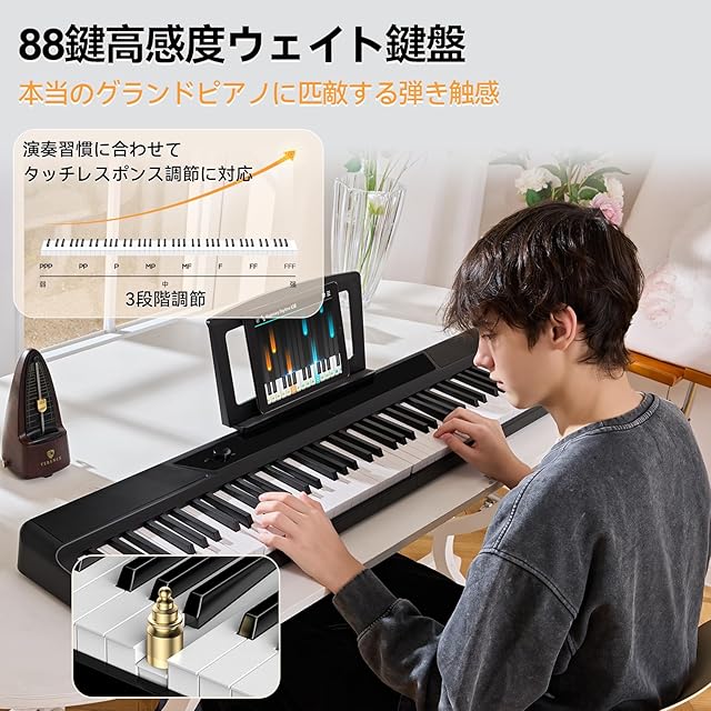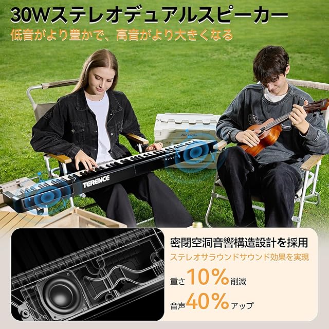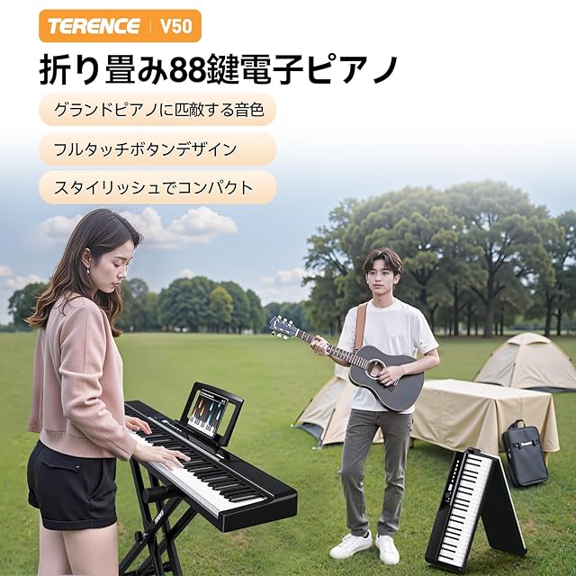 TERENCE 電子ピアノ 折り畳み 88鍵高感度ウェイト鍵盤 30Wデュアルスピーカー AUDIO A3音源チップ搭載 グランドピアノに匹敵する音色 フルタッチスクリーンボタン 音色シミュレーション技術 多様なピアノ音色 トリプルペダル対応 MIDI対応 充電可能 スリムでコンパクト 携帯便利 V50 ブラック