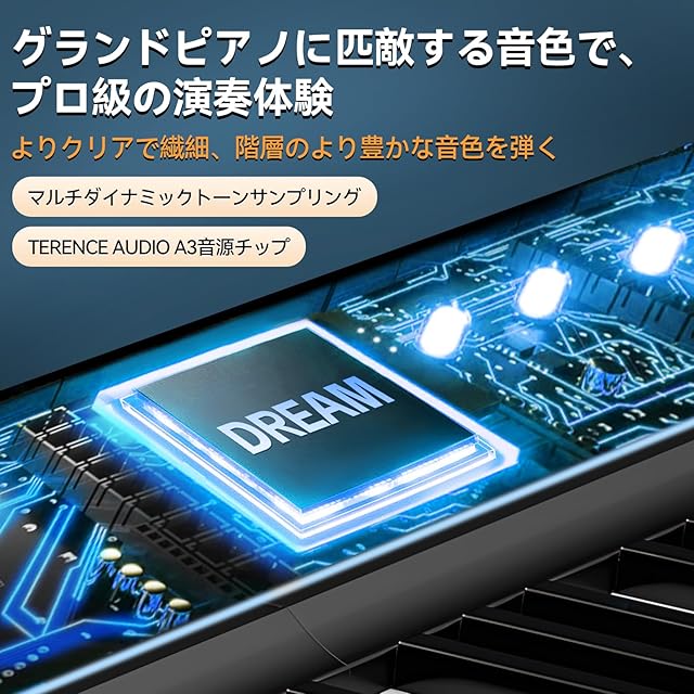 【本当のグランドピアノに匹敵する音色】V50電子ピアノは、マルチダイナミックトーンサンプリング技術を採用し、アコースティックピアノのような音色変化を弾くことができ、より繊細な演奏体験が得られます。更に、TERENCE独自開発したAUDIO A3音源チップを搭載しており、よりクリアで繊細、階層のより豊かな音色を弾くことができます