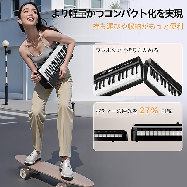 【折りたたみで持ち運びや収納が便利】V50電子ピアノは、前モデルに比べボディの厚みを27%削減し、より軽量かつコンパクト化を実現します。更に、ワンボタンで折りたためるデザインにより、持ち運びや収納がもっと便利です