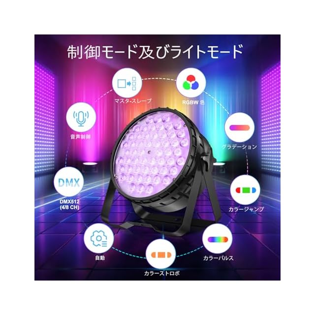 【4つモード&4CH・8CH選択可能】4つモード:1、自動モード2、音声制御(HDマイクを内蔵し、音楽に合わせてライトスタイルが自動的に変化する)3、マスタースレーブ(複数ランプ同期運転)4、DMX512。初心者もプロもうまく使えます。またスポット、ストロボ、ジャンプ、調光、音楽連動などの効果があります。