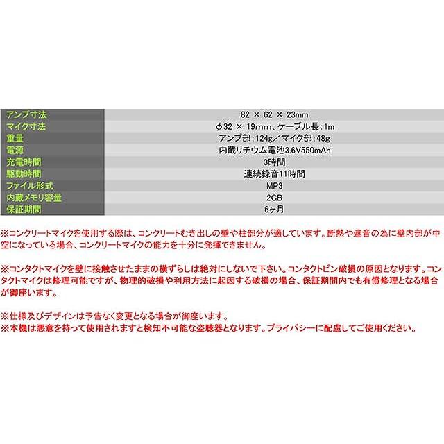 【高感度マイク採用でクリアに集音】犯罪捜査などでの情報収集でも高感度コンタクトマイクが壁向こうの音声をクリアに集音してくれます。※コンクリートマイクは、壁に伝わる微弱な振動から音声を集音する為、特にコンクリート壁で威力を発揮します。空洞がある壁や壁紙の種類によって、音声を拾いづらい場合が御座います。