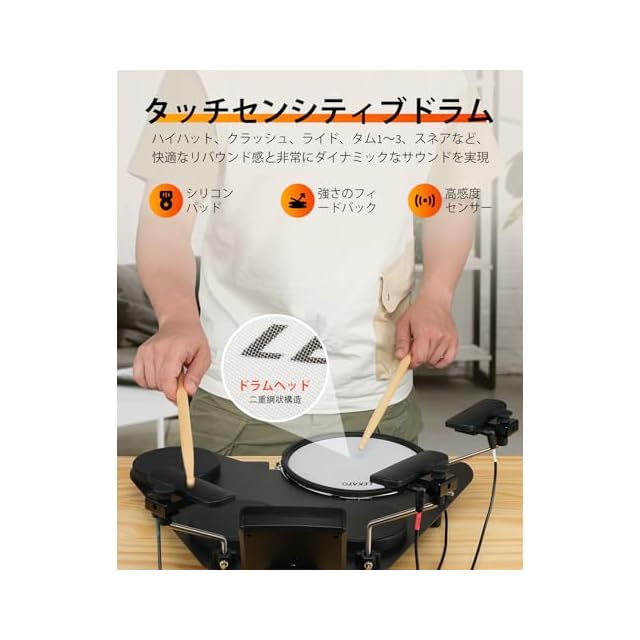 【常に異なるサウンド】スネア、ハイハット、クラッシュ、ライド、Tom1、Tom2、Tom3など、すべてのドラムはタッチセンシティビティを備えており、叩く力とスピードによって異なるレベルのサウンドを出すことができます。220以上のドラムサウンドと10のキット、さらに5つの自由に組み合わせ可能なドラムキット。