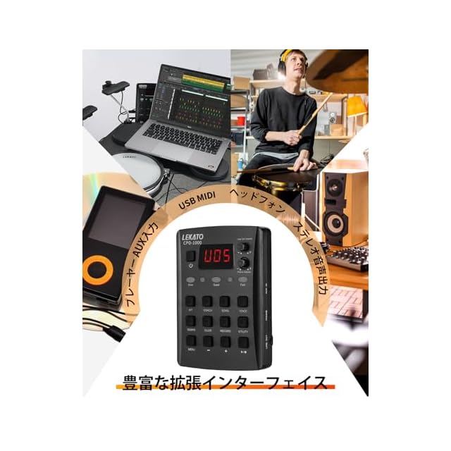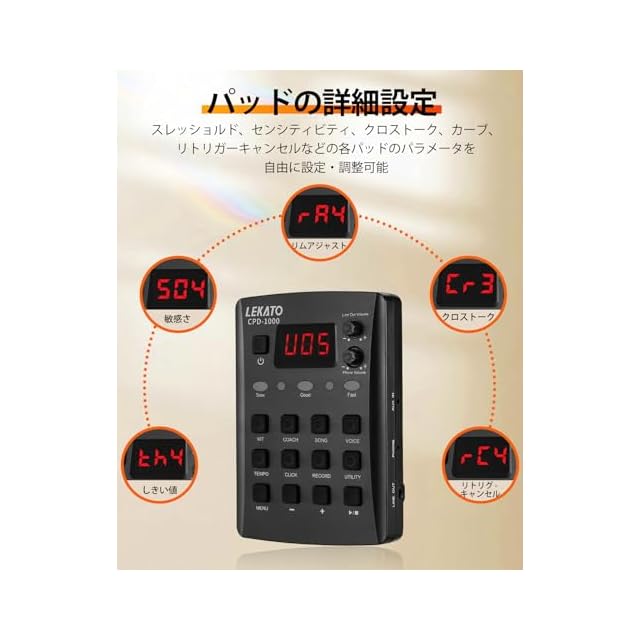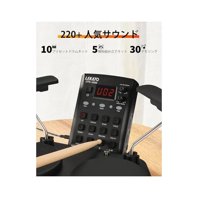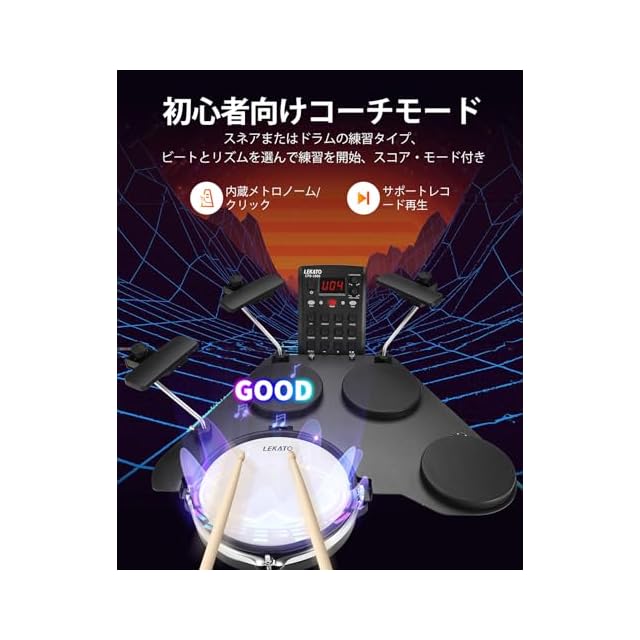 【初心者のためのデザイン】LEKATO CPD-1000 電子ドラムのコーチングモジュールには、30曲のデモソングと楽しい練習エクササイズが付属しており、子供たちのドラム演奏スキルの向上と発達をサポートし、初心者に最適です。タイミングと正確さを養うためのメトロノーム内蔵。