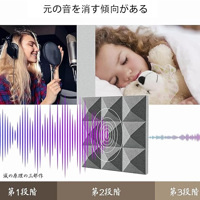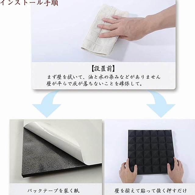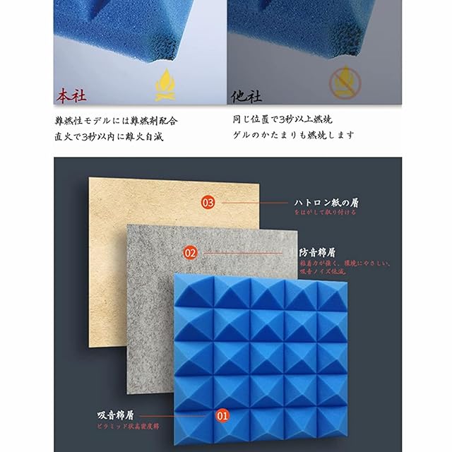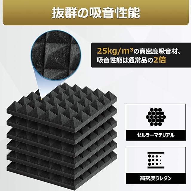 厚さ増加*高密度:吸音パネルの吸音や遮音効果はスポンジの密度と厚みによって決定されます。スポンジの密度が高いほど、厚いほど吸音や遮音効果が高いです!ほかのと比べると、防音材パネルは厚さ5cm、25㎏/㎥という高密度の極厚スポンジを採用しており、厚手で、高反発で更に防音効率が倍増する。より静かで快適な環境で高音質なサウンドが楽しめます。