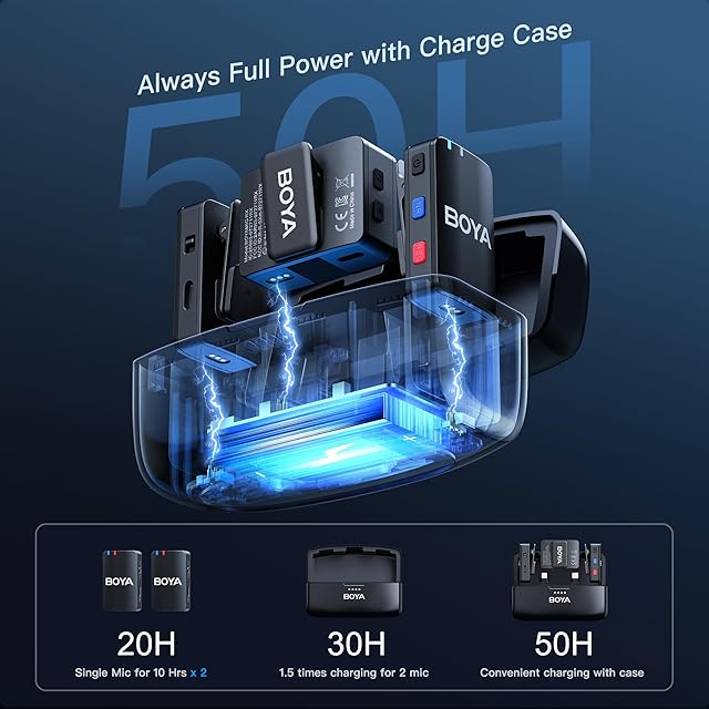 充電ケース付き-キットを持ち運びやすくする、送信機は最大10時間の動作時間(オンボード録画が有効な場合は約6時間)、送信機と受信機の充電時間は1.5時間、充電ケースの充電時間は2.5時間、充電ケースは(2 * TX + 1 * RX)1.2回の充電をサポートします。