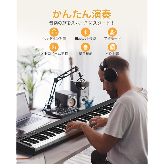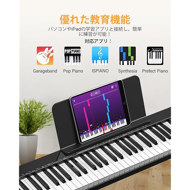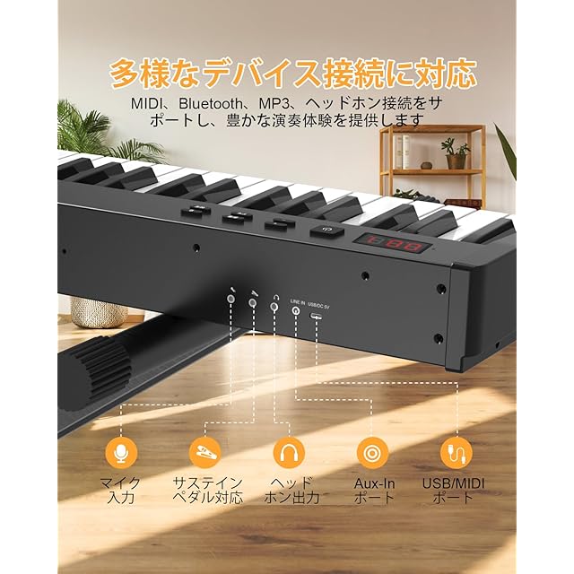 【MIDIとBT対応可能、様々な設備と接続可能】BTでiphoneやipadと連動でき、ピアノを弾くとAPP上に同期して記録や曲練習は大変便利。USBケーブルでPCに接続してもMIDIを利用できます。KP88SXはイヤホン、スピーカー、マイク、ペダルなど設備と接続でき、歌いながらピアノを弾いたり、伴奏を流しながら演奏を重ねたりと、多彩な用途で楽しむことができます。