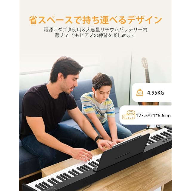 【さらにコンパクト&軽量】OYAYO KP88SX 電子ピアノは、市販の同類品よりもコンパクトで家庭用に最適なサイズ、123*21*6.6cmの小型ボディ、重さはわずか4.95kgで、生ピアノと同じサイズの鍵盤を持つ。自宅での練習はもちろん、旅行先や学校でも気軽に演奏を楽しめます。高さを7段階に調整できる高品質な専用スタンドも付きます。