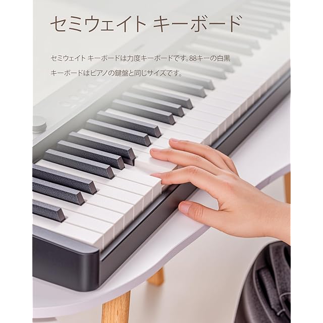 ピアノは標準的な88鍵盤を使用しており、初心者や子供にとてもフレンドリーです。22種類機能があります。初心者のピアノに対するすべての要求を満たします。スイッチキー、音量調節、音色、模範曲、ダブルトーン、メトロノーム、伴奏(リズム)、録音、再生、機能、延音、シフト、速度、教育A、教学B、和弦、二重キーボード、ビブラート、キーボードドラム、力度、キーボードランプスイッチ、スリープスイッチ。