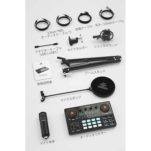 【付属品一覧&安心使用】AM200 ポッドキャストオーディオミキサー*1、USBケーブル(USB A-USB C)*1、3.5mmTRRS オーディオケーブル*2、ユーザーマニュアル*1、マイクアーム*1、ショックマウンド*1、マイク本体*1、マイクスポンジ、XLR-3.5mmケーブル*1。使用する前に、取扱説明書を必ずよくお読みください。ご注意:この機械は3.5mmマイク入力だげ対応します。