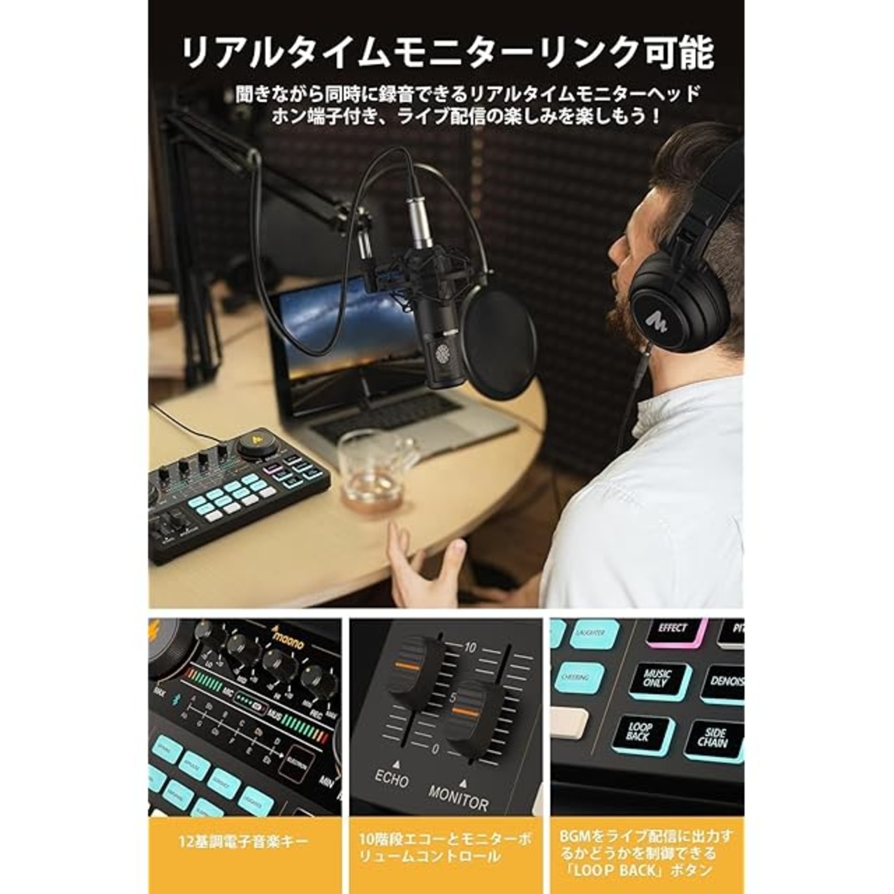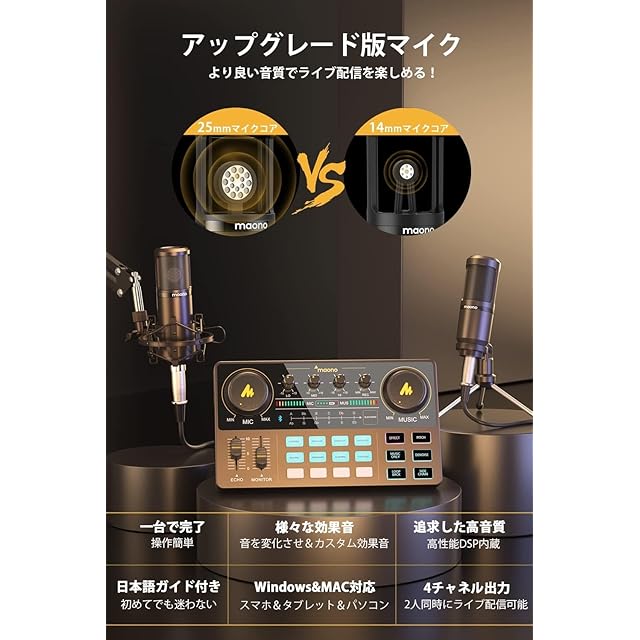 【一台で完了&プロなアーム式25MMラージカプセルマイク付属】MAONOCASTER AU-AM200-S6は、オールインワンポータブルオーディオミキサーセットです。音声信号の変化に俊敏に反応するDia.25MMラージカプセルコンデンサーマイクが搭載しています(S1セットのはDia.16MMです)。音声の微細なニュアンスも余すところなく再現します。この1台で、ライブ配信を華やかに楽しめます!