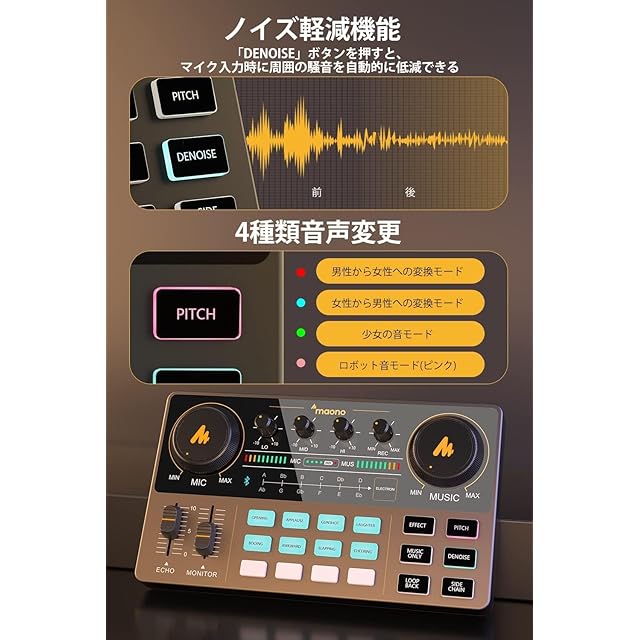 【6種類ボーカルFX&エフェクタープロセッサー】「PITCH」ボタンは4種類のボイスチェンジエフェクト(女声、男声、少女の声、ロボット声)が可能。「MUSIC ONLY」ボタンは音楽からボーカル音声を除去し、カラオケ用の音楽を作成できます。「DENOISE」ボタンは入力時の周囲のノイズを低減できます。他のSIDECHAIN、EFFECT、LOOPBACKボタンはその他の音声エフェクトも可能です。
