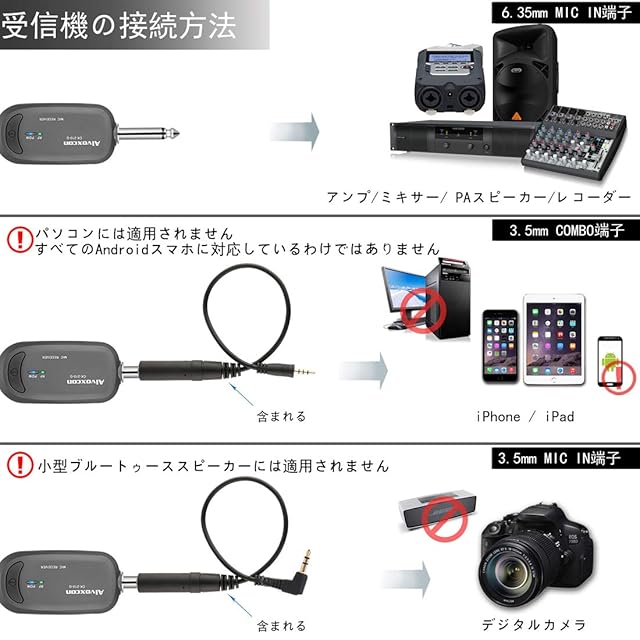 【素晴らしい互換性】:本製品は、Mic in入力端子を持つスピーカーに直接使用して拡音作用を実現するだけでなく、付属のスマホ用の6.35㎜TRRS中継線とカメラ用の6.35㎜TRS中継線があるので、スマホ(iPhone 7以上のモデルであればiPhone - 3.5 mmヘッドフォンジャックアダプタが必要です。)やカメラで録音録画機能を実現することも可能です。店舗の販促、ツアーガイド、講演会、収録、授業、プレゼンダー、司会などのイベントに最適なワイヤレスマイクです!ご注意:本商品はパソコンと互換性がないかもしれませんが、パソコンに対応したいなら、当店のUSBワイヤレスマイク(UM310)を買うことをお勧めします。