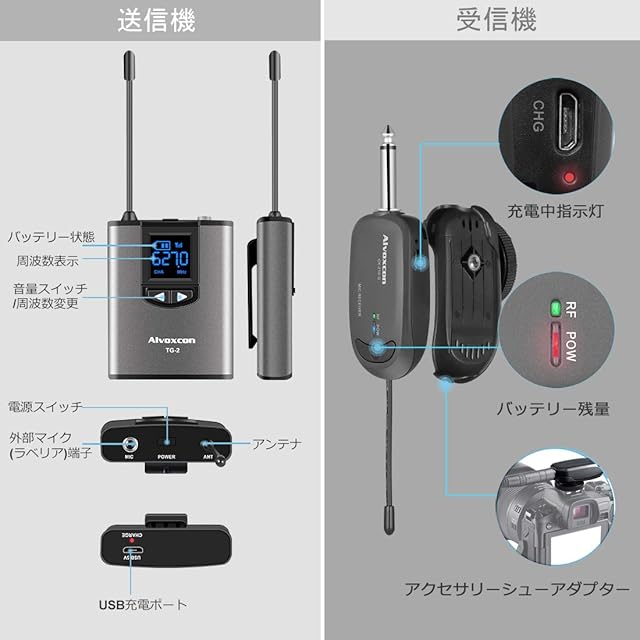 【セット内容&Alvoxconの品質保証】:セット内容:送信機*2、受信機*1、ヘッドマイク*2、クリップマイク*2、スマホ用の6.35㎜TRRS中継線 *1、USB充電ケーブル*1、カメラ用の6.35㎜TRS中継線×1、アクセサリーシューアダプター×1、日本語取扱説明書*1。弊社は商品品質やお客様のご使用体験を何よりも重視しておりますので、初期不良の場合はメールよりご連絡を下さいませ。ご購入後1年間の長期保証を設定しておりますので、万が一、ご購入した商品は不具合などございましたら、弊店にご連絡頂ければ、できるだけ素早く対応させて頂きます。