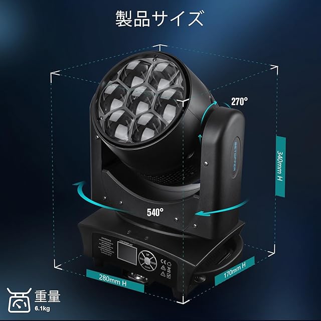 ◆7x40W LED高輝度設計:3000ルーメンを超える強力光束であらゆるサイズのステージを照らし、高速回転時も鮮明なビームを維持。鋭い光の浸透力を実現。