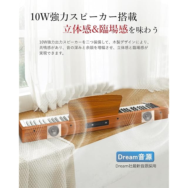 【演奏感と臨場感溢れる音源&2つスピーカー内蔵】フランスのトップメーカーであるDREAM音源をデジタル化したもので、グランドピアノに匹敵する卓越した演奏体験とリアルな音質を提供します。強力な10Wのステレオサラウンドスピーカーを内蔵し、豊かなサラウンドと魅力的な音色が特長です。これにより、音楽の魅力が格段に向上し、より深みと立体感のある音楽を楽しむことができます。
