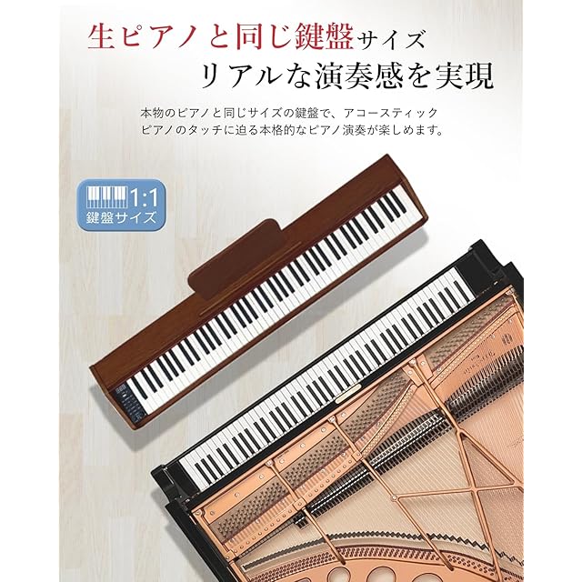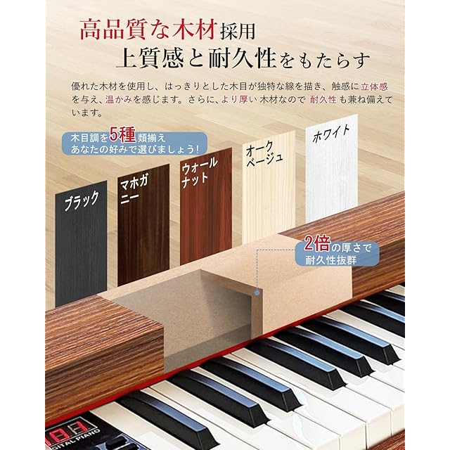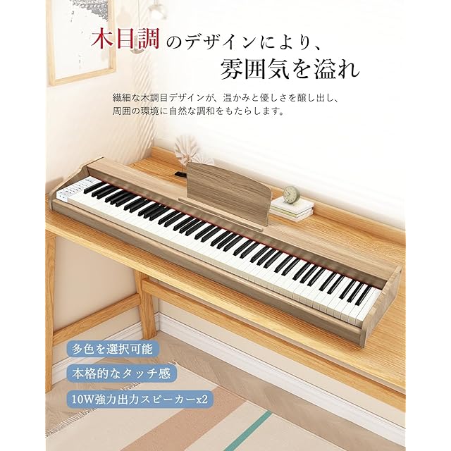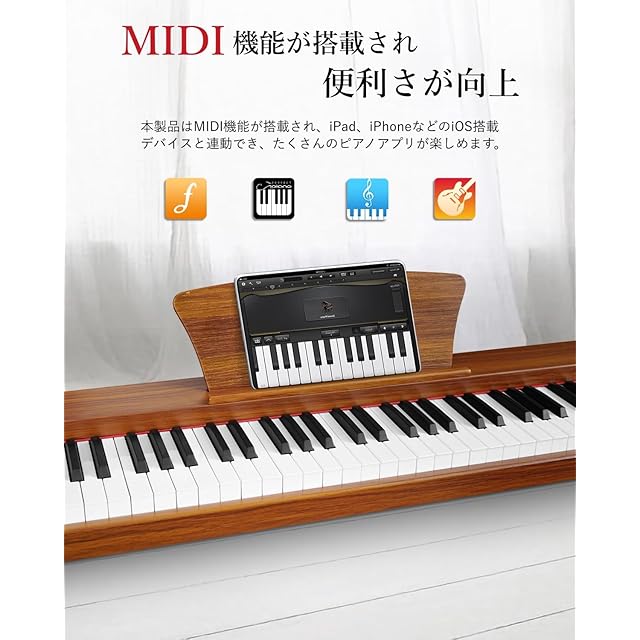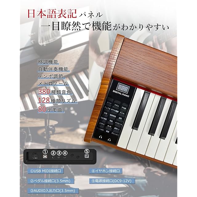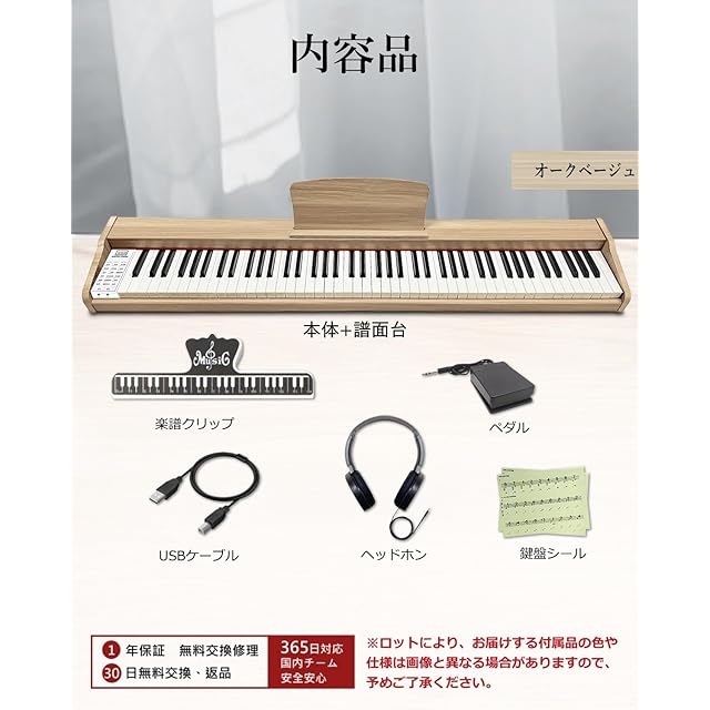 【指力感知機能搭載】鍵盤を弾く強さによる音の強弱の表現ができますので、曲の音量の微妙な変化を楽しむことができます。【充実な付属品】変換アダプター、楽譜クリップ、譜面台、練習用イヤホンや初心者用の剥がしやすい透明鍵盤シール、USBケーブルが付属されます。【1年保証】ご購入頂いた日から30日以内無条件返品・返金保証、何か不明があったらぜひお気軽にお問い合わせください。