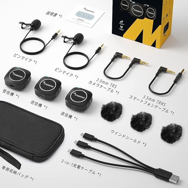 ♬【パッケージ内容】送信機x2、受信機x1、3.5mm TRRSスマートフォンケーブルx1、3.5mm TRSカメラケーブルx1、ピンマイクx2、ウインドマフx3、3-in-1充電ケーブルx1、専用収納バッグx1、日本語説明書x1。ご購入日から一年の安心保証が付き、使用中に何か問題がございましたら、お気軽にご連絡ください。