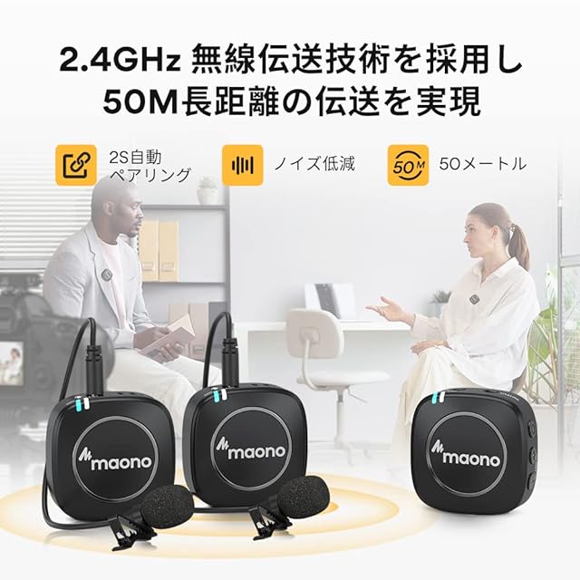 MAONO ワイヤレスマイク 無線マイク 2.4GHz ワイヤレスピンマイクシステム ピンマイク 一眼レフマイク スマホビデオカメラ用外付けマイク 内蔵マイク 最大50M伝送距離 ノイズ低減 自動ペアリング ミュート可能 技適マーク認証済 コンパクト 録音/録画/宅録/生放送/Vlog用(WM820 A2)