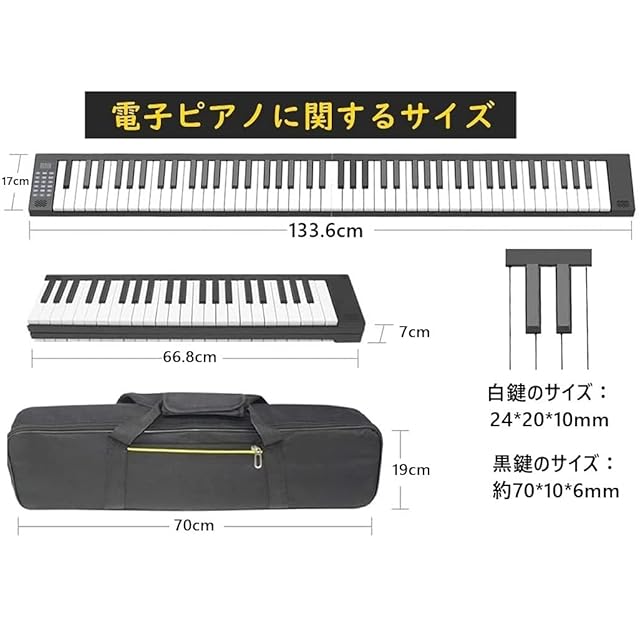 【折り畳み可能&携帯便利】本88鍵盤電子ピアノは折り畳み可能です。二つ折り前のサイズは133.6*17*3.5cmで、二つ折り後のサイズは66.8*17*7cmです。世界一番小さいサイズを誇って収納はとても便利。本体重量がわずか3.7kgで、専用ケースも付いているのでご自宅内での移動、屋外での演奏、社団での練習も気軽!❗
