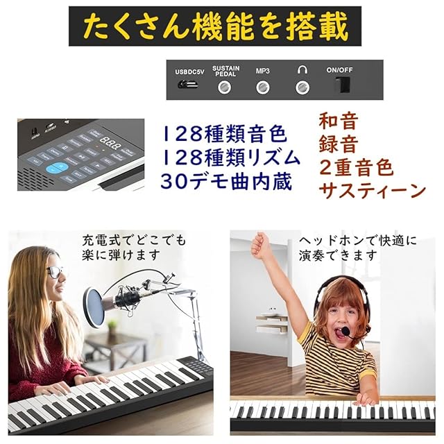 【機能たっぷり】128種類音色、128種類リズム、20デモ曲内蔵、2重音色、サスティン、和音なども対応可能。初心者に欠かせない機能がいっぱい付いております!また、MIDI対応でPC、iPhone、iPadなどと連動、perfect pianoなどいろんなピアノアプリが楽しめます。