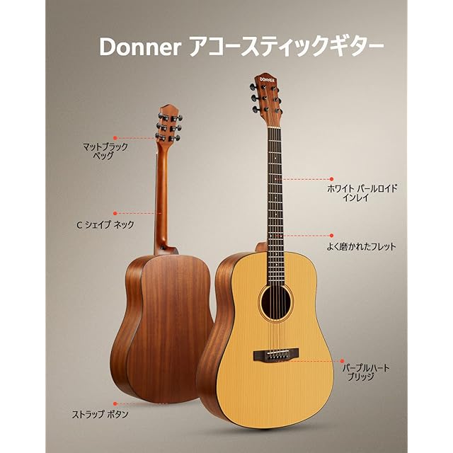 【41インチドレッドノート】Donnerアコギはダイナミックレンジの広いクラシックなドレッドノートボディ形状を採用し、サウンドは非常にバランスが取れていた上、押し出しが強く迫力があるのが特長で、幅広いミュージックスタイルに対応可能です。