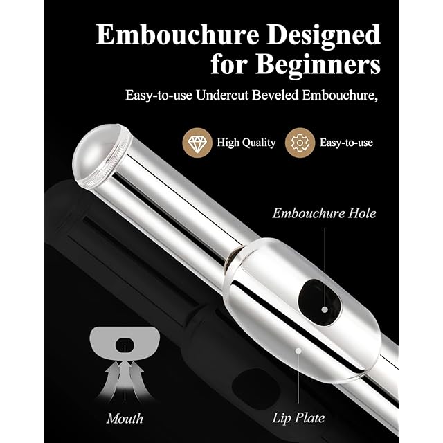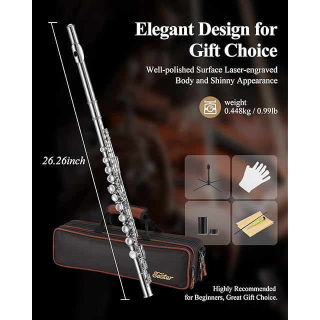Eastar フルート カバードキー 16穴 Eメカ付き オフセット ニッケルメッキ スタンド&専門ケース 初心者セット (シルバー) 開学 プレセント