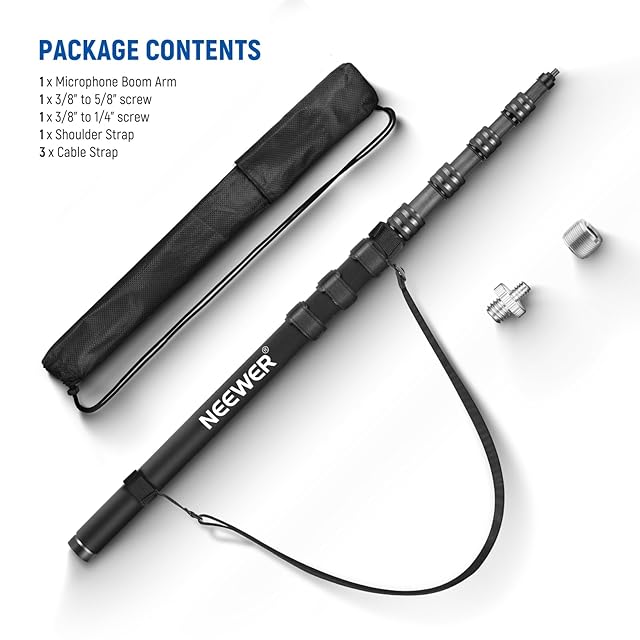 【パッケージ内容】1×延長ブームポール、1×収納バッグ、1×ショルダーストラップ、3×ケーブルストラップ、1×3/8"~5/8"アダプター、1×1/4"~3/8"アダプター