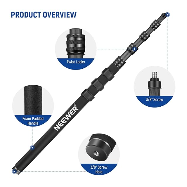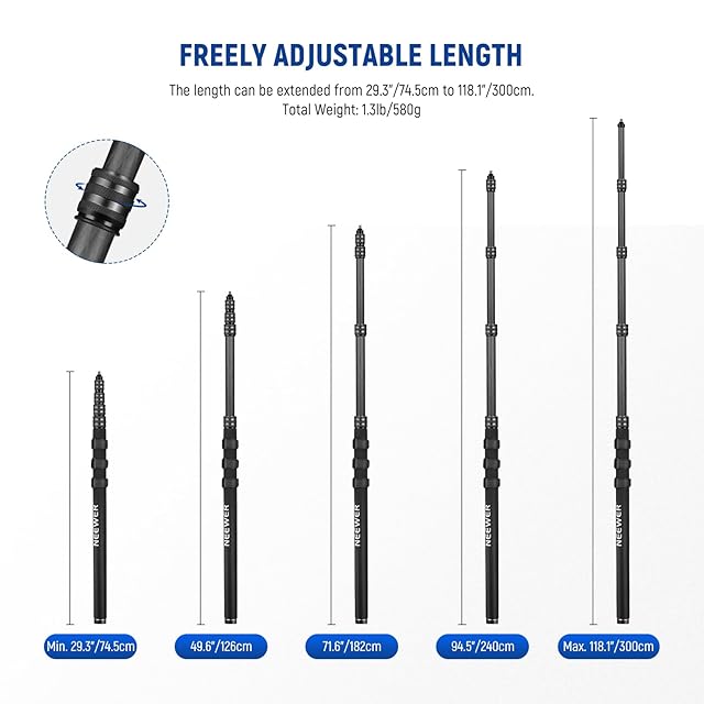 【長さ調節可能】5つのセクションを備えた伸縮ブームは、必要に応じて2.4フィート(74.5 cm) から9.8フィート(300 cm)まで調整でき、ツイストロックにより、セクション間の迅速かつ確実な固定を実現します。
