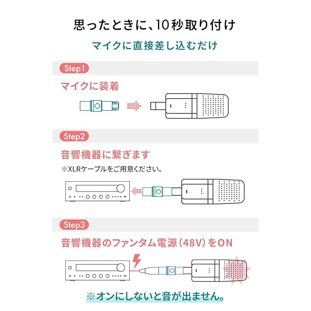 【 ※ご使用前に必ずお読みください※ 】 ●本機をマイクに挿入しただけでは音はでません。ファンタム電源(48V)をオンにしてご利用下さい。●ノイズを抑制する効果はありますが、除去するものではありません。ゲインを過度に上げるとノイズが発生する可能性があります。●リボンマイクやダイナミックマイクには使用できません。