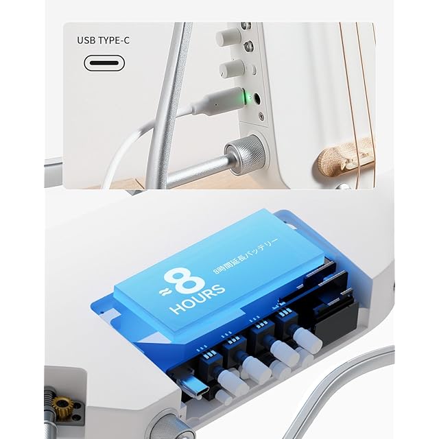 【旅を軽快に】HUSHトラベルギターシリーズの独特のヘッドレスデザインに基づき、I PROの重量はわずか2.1kgです。アップグレードされたクイックディスコネクト亜鉛合金ブラケットを採用し、迅速かつ強固な組み立てが可能です。8時間のバッテリー寿命とUSB-C急速充電インターフェースを備え、旅行、演奏、集会、練習セッションに最適です。