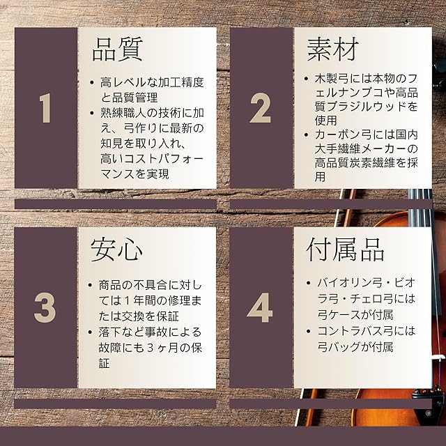 アルティジャーノ&バイオリンの楽弓は、安心の1年保証付きです。保証内容の詳細は別途画像をご覧ください。